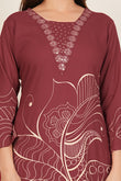 Crafted from premium Rayon, this outfit offers a soft, flowy silhouette with excellent comfort. The print detailing along the kurta and sleeves adds a touch of charm and elegance. Its work neckline enhences the overall festive appeal. Perfect for casual outings or semi-formal occasions.